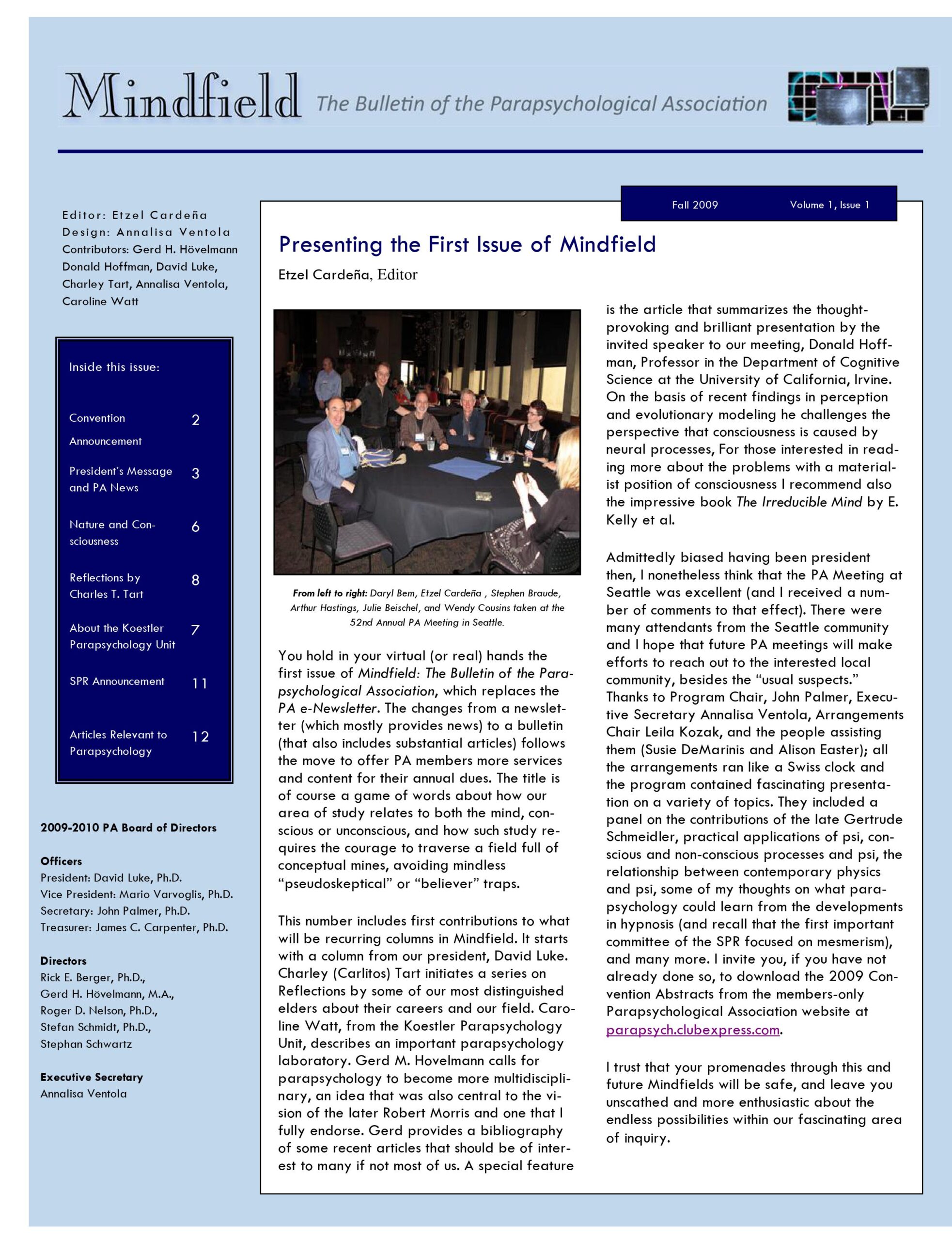 by Etzel Cardeña The original article first appeared in: Cardeña, E. (2009, Fall). Presenting the first issue of Mindfield. Mindfield: The Bulletin of the Parapsychological Association, 1(1), 1.